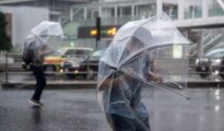 People shelter under umbrellas from the wind and rain as they cross a road near Shinjuku train station on October 12, 2019 in Tokyo, Japan ahead of Typhoon Hagibis’ expected landfal later in the evening. More...